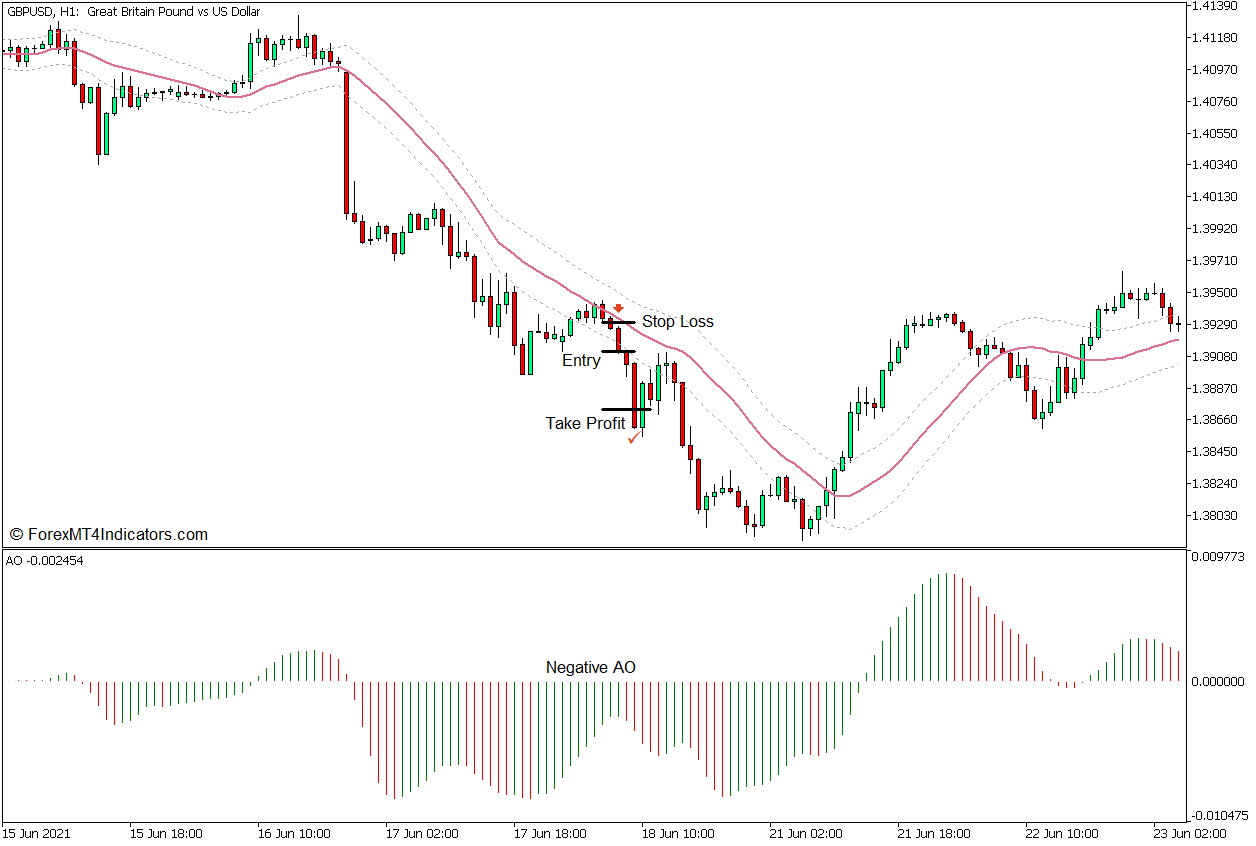 - Open a promote order as quickly as worth motion reveals indicators of worth rejection on the world of the center line and a bearish momentum candle closes beneath the decrease line of the Adaptive ATR Keltner Channel.
