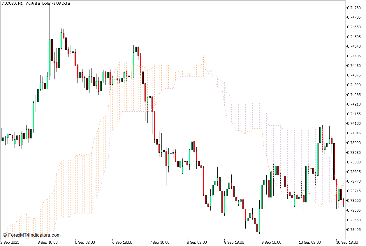 The Kumo, which interprets to “cloud” in Japanese, is aptly named as such as a result of the 2 strains type a cloud like construction when plotted collectively. The world inside the Kumo is shaded to point the route of the long-term development. It’s shaded sandy brown at any time when the Senkou Span A line is above the Senkou Span B line, indicating a bullish long-term development. Inversely, it’s shaded thistle at any time when the Senkou Span A line is beneath the Senkou Span B line, indicating a bearish long-term development. Merchants usually use this indication to filter trades primarily based on the route of the long-term development.