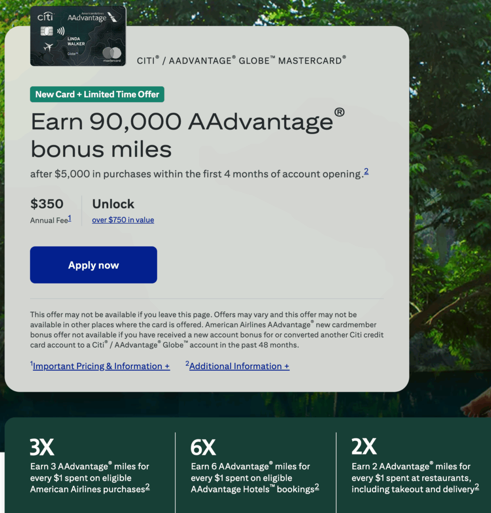 Signup bonus not obtainable in case you have acquired a brand new account bonus for, or transformed one other Citi bank card to, a Citi / AAdvantage Globe account prior to now 48 months. (This 48-month clock is separate from different Citi / AAdvantage playing cards.)