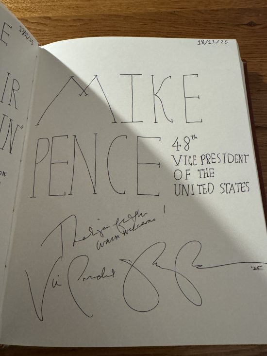 I used to be amused to be taught when signing the visitor guide that I had adopted a former vice-president, Mike Pence of the USA, who had spoken the night time earlier than to a bigger viewers, I feel, however we have now completely different appeals.