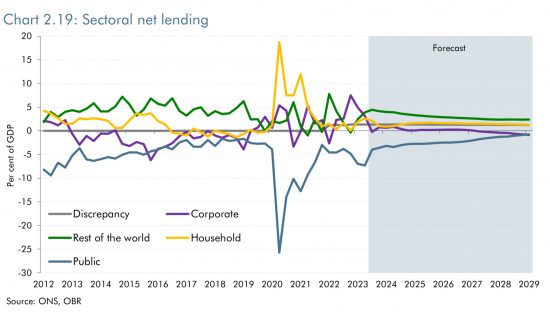 The proof of latest years is that households will not be superb at saving, besides in the course of the Covid disaster. By and enormous, additionally they appear to have spent the cash they saved then. The most recent forecast for the sectoral balances, as ready in November 2023 by the Workplace for Funds Accountability, as famous beneath, reveals that they don’t forecast any change to the modest internet financial savings now made by households for a while to come back.
