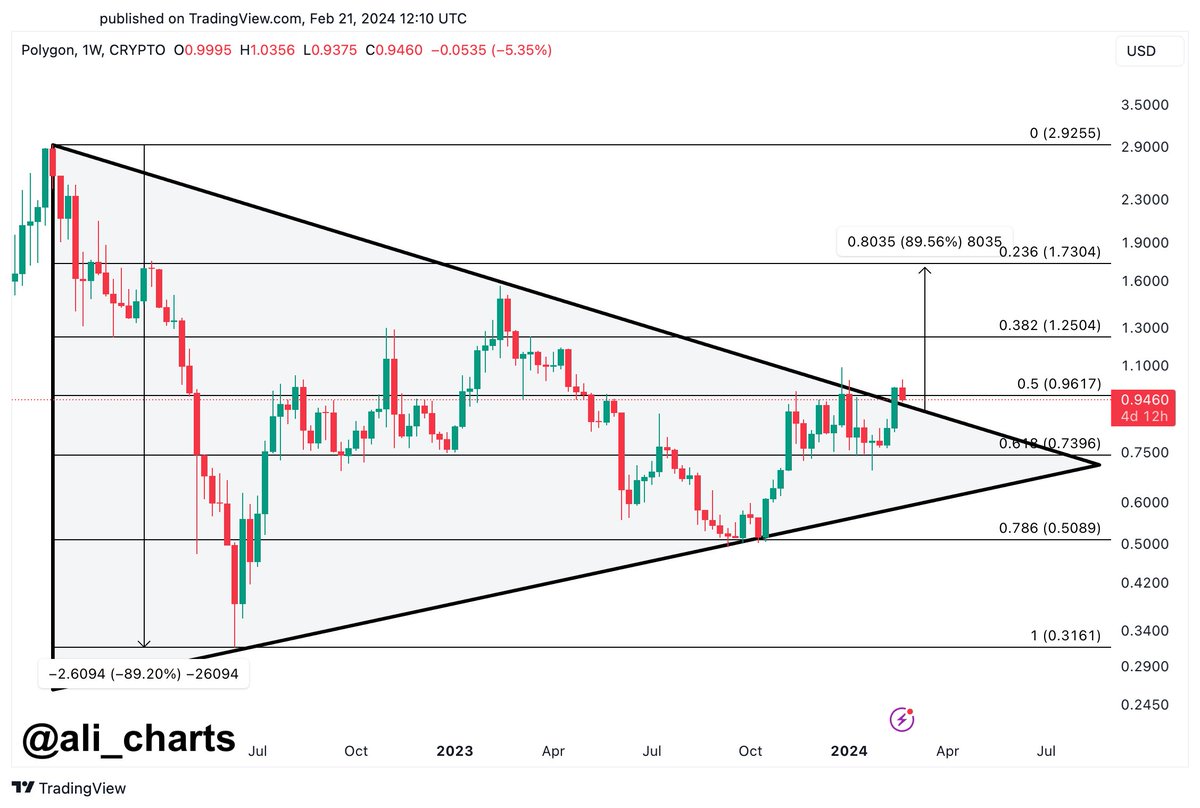Now, right here is the chart shared by Ali that exhibits a Symmetrical Triangle sample that the weekly value of Polygon has traded inside for the final couple of years: